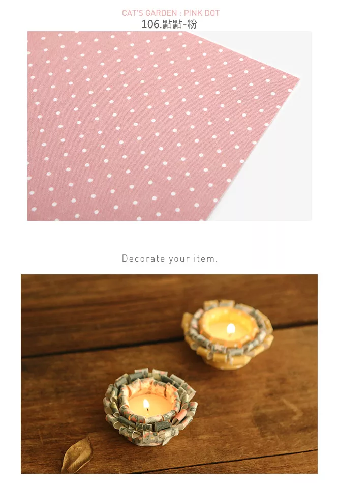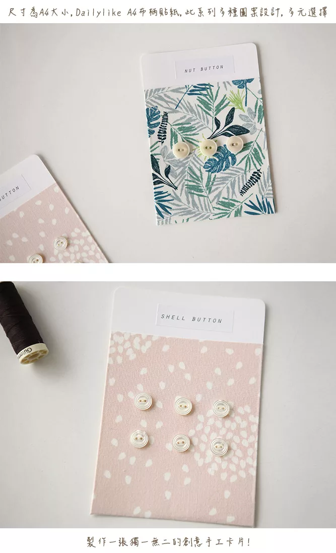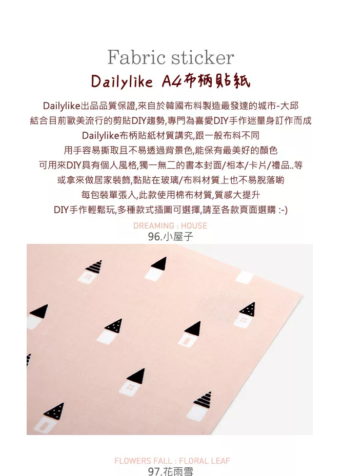 專門為喜愛DIY手作迷量身訂作而成,Dailylike布柄貼紙材質講究,跟一般布料不同,特色在於用手也好容易撕取且不易透過背景色,